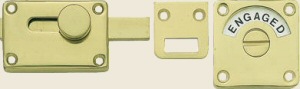 This brass bathroom bolt external plate measures 50mm x 50mm and displays 'ENGAGED' or 'VACANT' depending on the position of the bolt. The internal surface mounted case measures 60mm x 40mm.