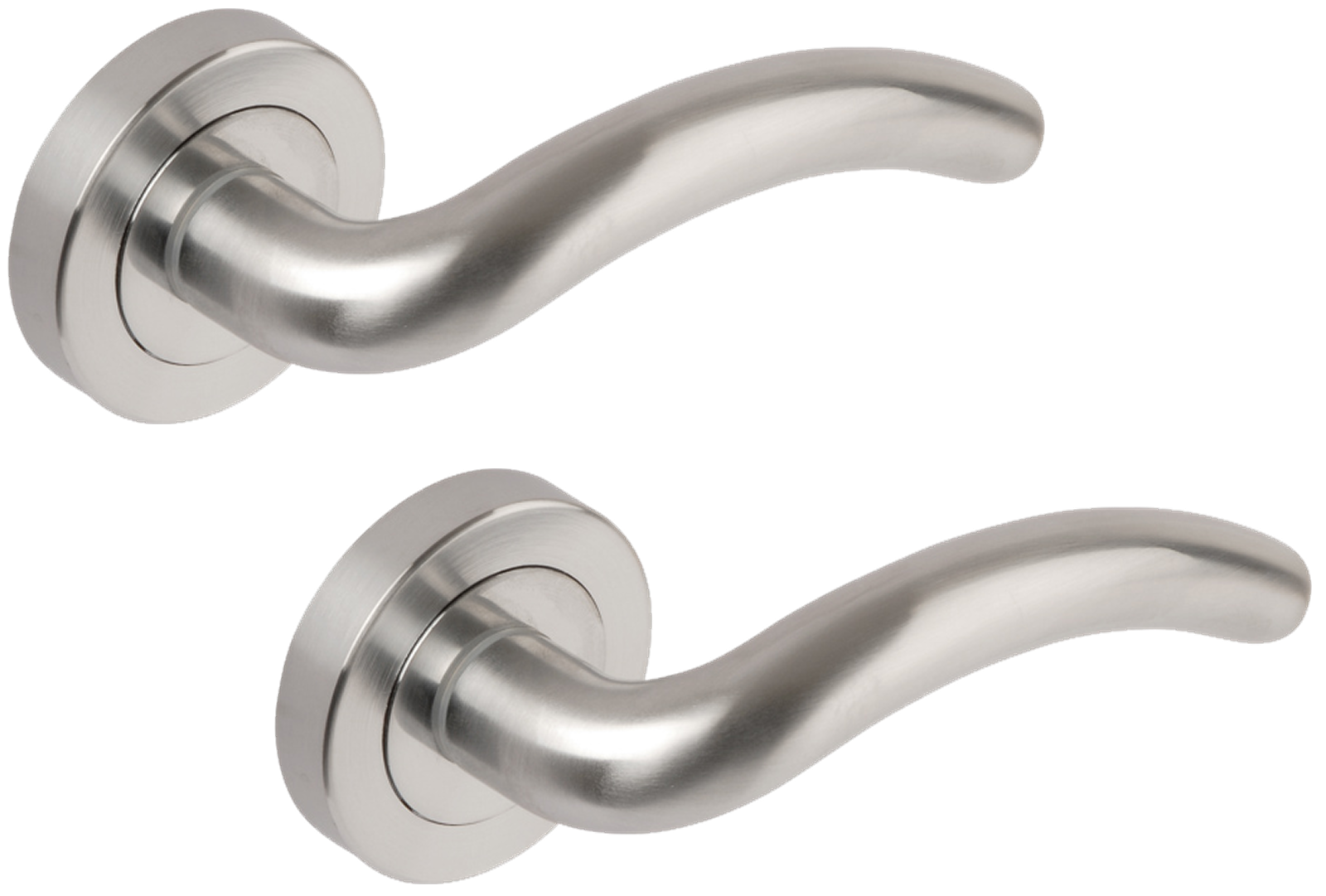 This pair of satin chrome Hawk lever on rose door handles feature 16mm round bowed levers mounted on a 52mm diameter screw-on rose that conceals the fixings providing a plush modern appearance.