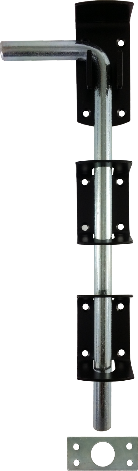 This 12 inch garage drop bolt is ideal for garage doors, utility doors and gates etc. This drop down bolt is supplied with black Japanned brackets and a zinc plated bolt and keep.