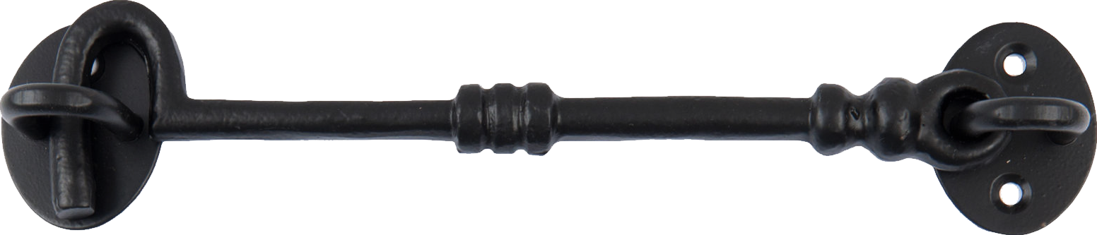 This premium quality 8" inch black iron cabin hook and eye is manufactured from malleable iron, the mounting eye is manufactured from steel. The black epoxy finish is ideal for all types of doors & windows in both interior & exterior applications.