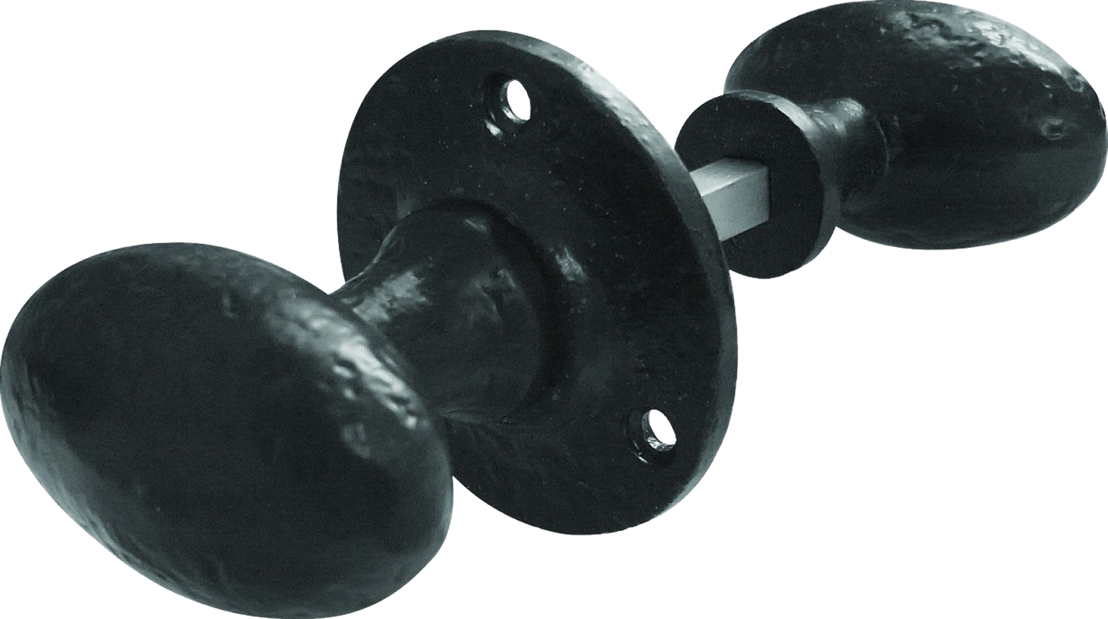 Vintage style un-sprung black antique oval door knob set for surface mounted rim locks, traditionally cast from durable malleable iron is a timeless design and the perfect choice for traditional and period homes.