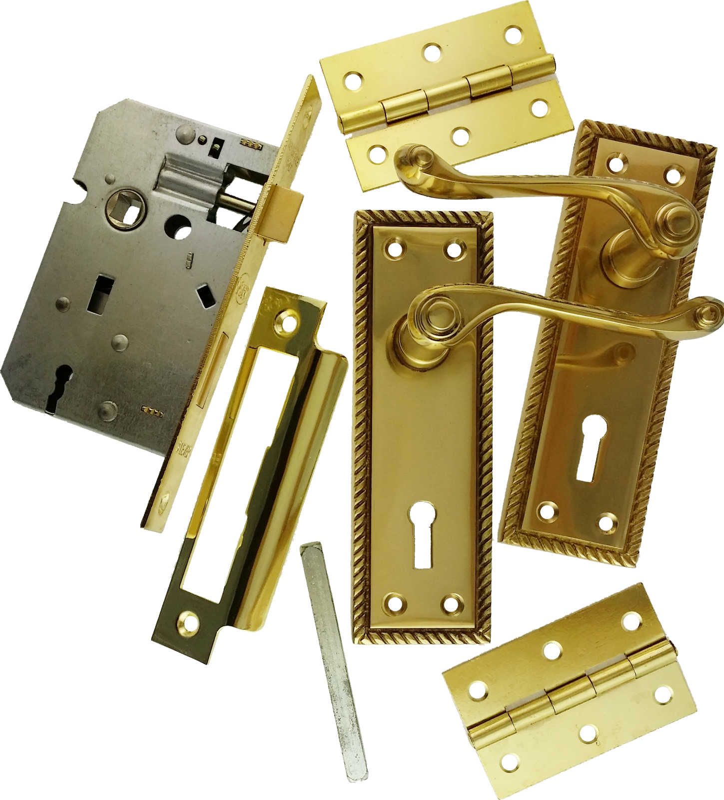 Georgian Handles Hinges & 2.1/2" Premium 3-Lever Lock Pack Polished Brass