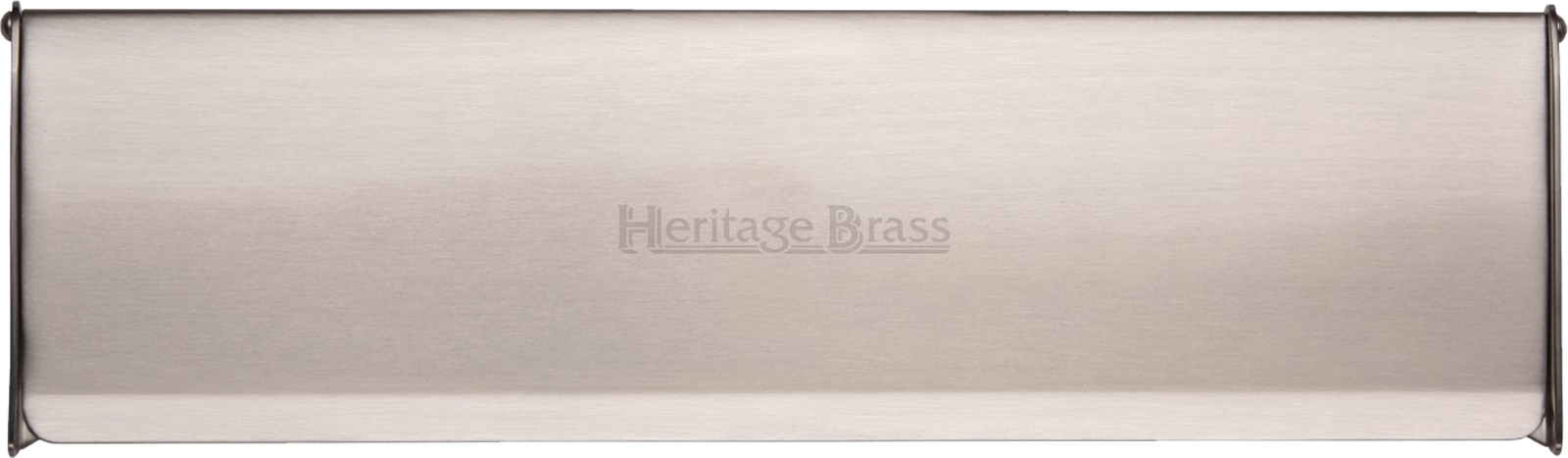 12 x 3.¼ inch premium UK quality internal letter tidy from the Heritage collection in a lacquered brushed satin nickel finish is a gravity flap interior letter box cover plate that will improve the aesthetics or your door covering unsightly letter box cut-outs.