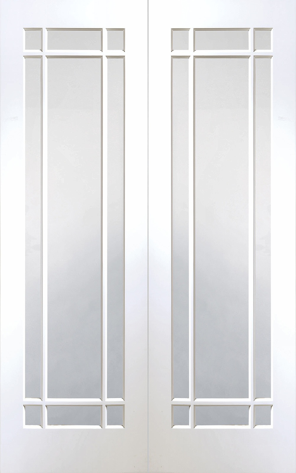 This white primed clear glazed rebated door pair from the Cheshire collection have an overall width of 1168mm by 1981mm high by 40mm thick. Featuring a 9 light design with a large clear toughened glass panel, framed with solid timber 'muntins' (glazing bars or narrow mullions) that create a well-balanced and appealing design suitable for both traditional and contemporary interiors.